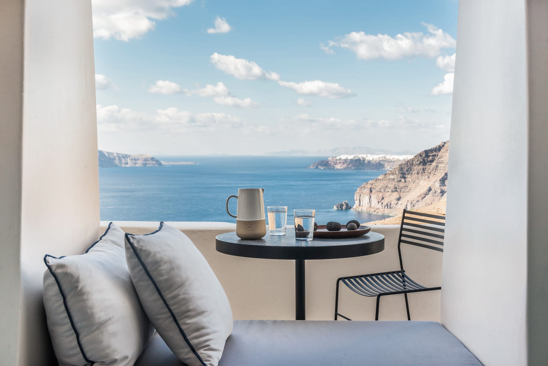 Situated on privileged location, on Fira’s Caldera cliffs, with magnificent views of the volcano, the deep blue of the sea and the most famous sunset from your private balcony. A stylish property newly renovated consisting of 12 suites with a Cycladic style using local materials stone-built suites with organic forms and smooth curves blended nicely with whitewashed walls combines simplicity with luxury.