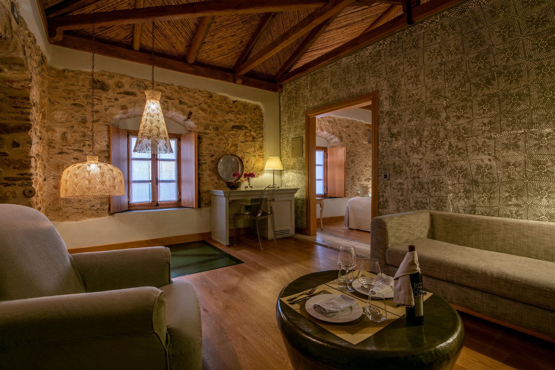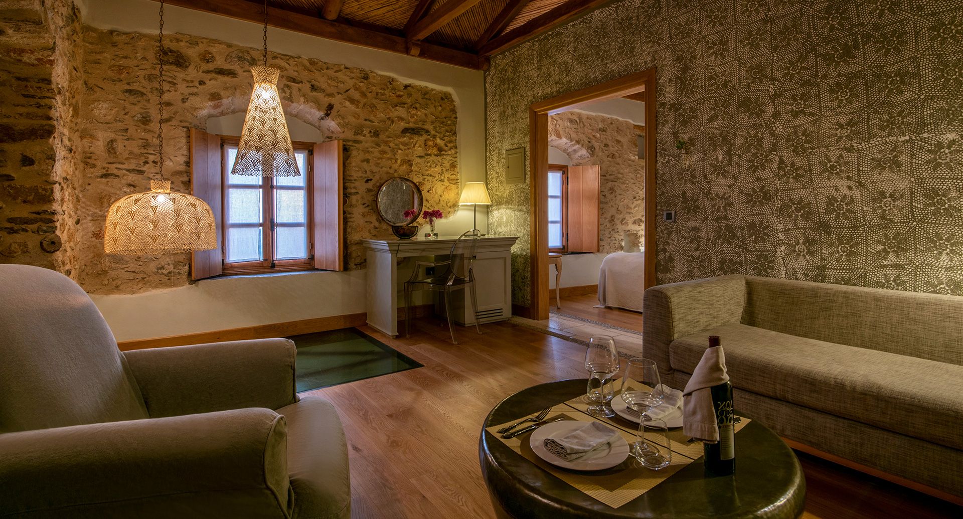 All the accommodation options we offer you are completely different from each other, as they are a combination of the existing historic building and the curative study upon which we based the final design and decoration. At the same time, however, we have adopted some basic principles in all our accommodation spaces that are evident in their common features. Features such as the application of traditional, handmade "lace" tapestry on the walls, the embossed headboards, the impressive wooden ceilings with herringbone reed interiors, the luxurious marble bathrooms, the traditional wooden shutters and corresponding doors, the handmade carpets, the top-quality linens, and the balance between vintage and modern decorative design objects. Always keeping in mind the comfort, relaxation and meeting our guests every need, we have equipped the rooms of Kinsterna Hotel with modern amenities- such as smart TV, high-speed wireless internet, queen or king size beds and a pillow menu.