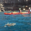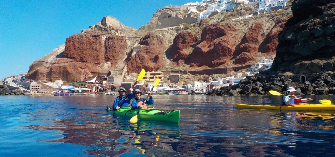With a transfer arranged for you, arrive at Mesa Pigadia, a black beach on the south coast of the island where your sea kayak tour will begin. Paddle along the coastline admiring beautiful rock formations and cave houses built into the cliffs. You will reach the Black Mountain and the Akrotiri lighthouse, exploring sea caves along the way. Paddling east, pass by the White Beach named for the imposing white cliffs above, and continue to Kampia Beach. Enjoy a fresh nutritious snack at the traditional tavern on Kampia Beach and go snorkeling from the beach. Back in your kayak, paddle to the Red Beach and marvel at the colors, vivid evidence of volcanic activity.
