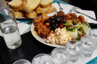 1st Stop:Tasting- kalamata olive, throuba olive, feta, graviera, spoon sweet,2 types of greek olive oil with bread, a traditional dip with bread, dried figs 2nd Stop: You will share each piece of spinach pie and bougatsa 3rd Stop: we will taste a seasonal fruit, probably tangerine 4th Stop: We offer you a small cup of greek yogurt with honey and nuts 5th Stop: A shot of mastiha or three shots of ouzo, tsipouro 6th Stop: We will have the chance to taste Loukoumades with chocolate or honey and Greek coffee 7th Stop: Tasting a small fried fish in a cone